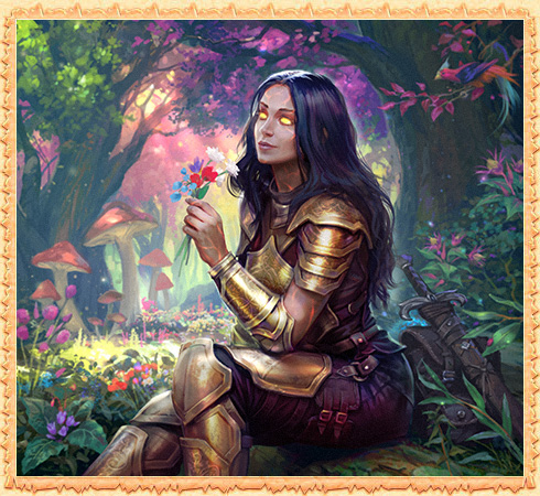 Astonishingly beautiful flowers are growing in the magical Dindaat Forest, on the slopes of the sacred Mountain of Mystras! These are the ancestral homelands of the mighty Genies, the cunning Ifrits, the talking mushrooms and the reckless mandrakes. However, the beautiful magmar warrior lady also feels at home here.