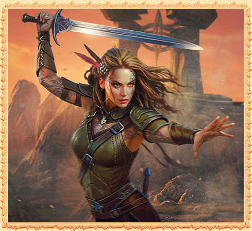 Even the fiercest beasts from the dark recesses of the Limbo of Mystras cannot hold back this warlike beauty! With her sharp blade, she paves the way, and the fearsome Leader would rather retreat into the depths of underground instead of facing her onslaught.